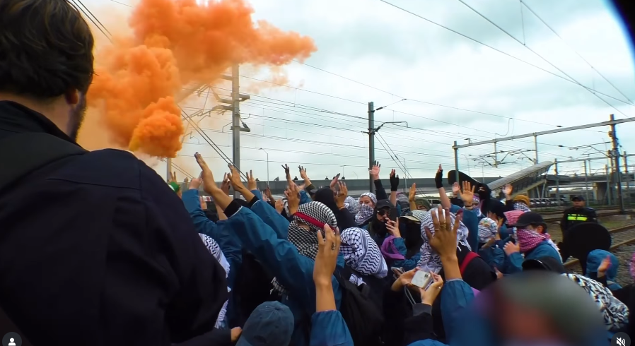 400 people signed up in just a couple of weeks to join a day of direct action on the 11th, with multiple tactics deployed against an ArcelorMittal factory in solidarity with the people of Gaza. The international steel giant still provides the state of Israel with its products. The coalition included groups such as Code Rouge, Stop Arming Israel, Soulèvements de la Terre Brussels and Against the Flow. Some part of the action got blocked already at train stations in the Dutch-speaking part of the country, but other fingers managed to reach their target and heavily disrupt the location.
